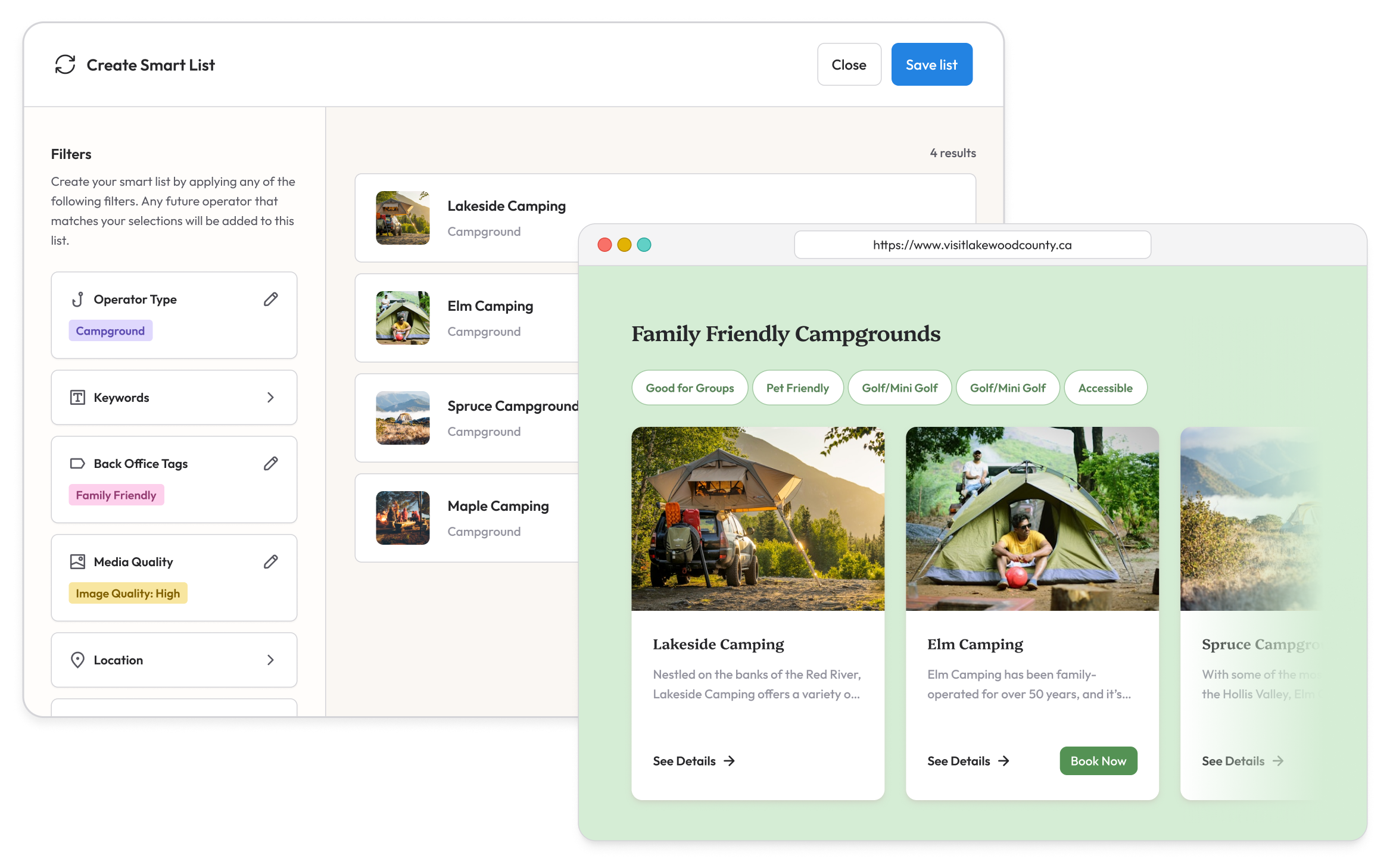 Use any standard or custom tag to create a list for your next campaign. Want to know which operators are family-friendly, have pools, and are open May to September? You can do that.